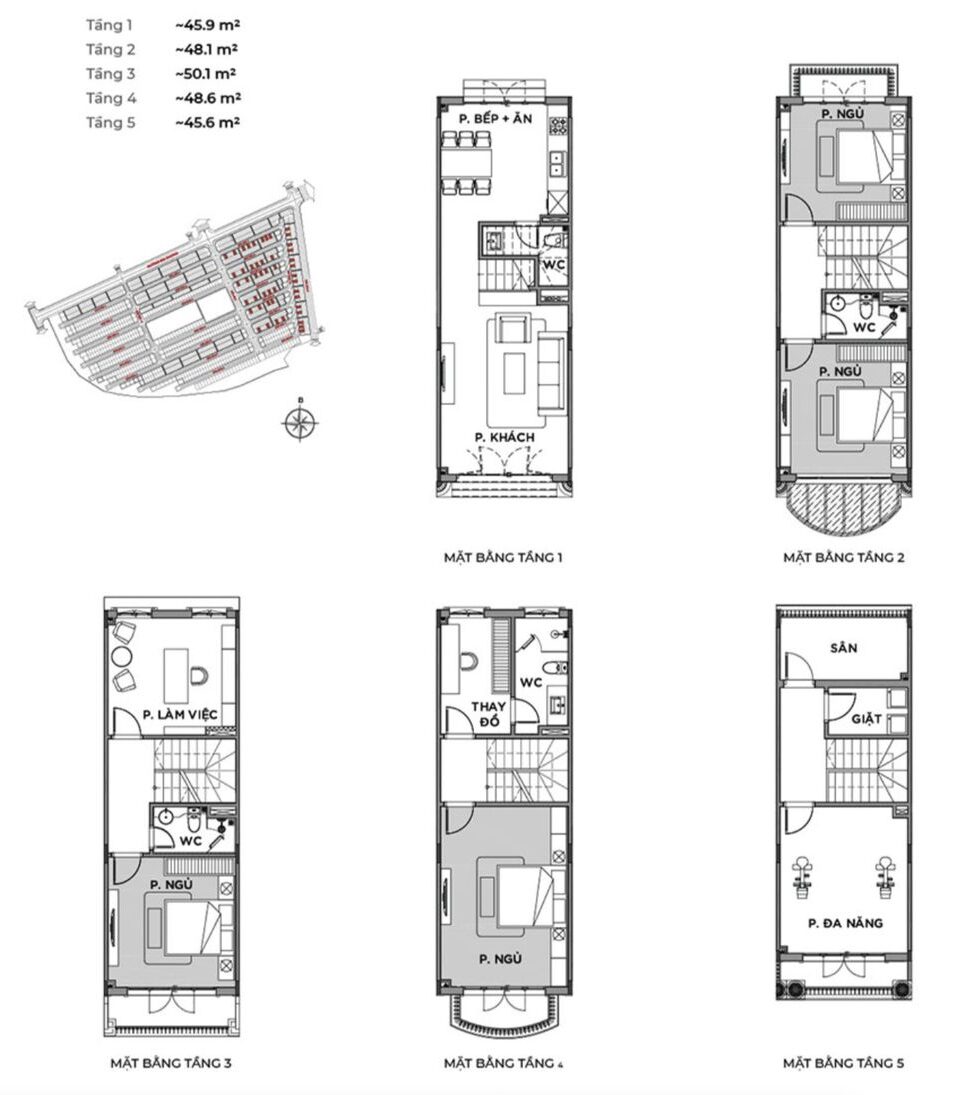 Tầng 4 – 5 là khu đa năng gồm phòng ngủ phụ, sân thượng hoặc khu giặt phơi. Không gian này có thể linh hoạt bố trí theo nhu cầu của từng gia đình.